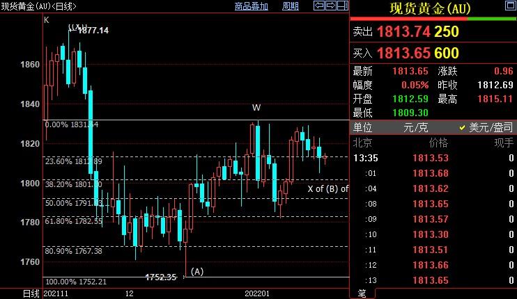 北京时间13:36,现货黄金上浮0.01%至1813.93美元/盎司;COMEX期金主力合约上浮0.04%至1813.2美元/盎司;美元指数下跌0.15%至95.655。