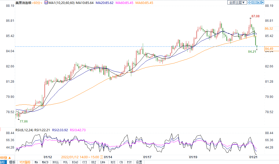 周四(1月20日)布油尾盘下跌1.2%,报收87.38美元/桶。此前连续几天因供应紧张忧虑而上涨,指标原油在这轮涨势中触及七年高位。早前公布的数据显示,美国原油库存温和增长,且美国三大股指相继由涨转跌,使得油价承压。