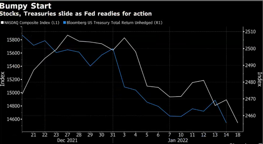 随着交易员越来越预期3月加息启动后,几个月内美联储将开始缩减债券组合,股票投资者变得越来越谨慎。
