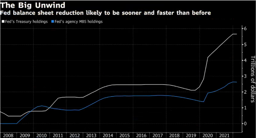 彭博首席美国经济学家Anna Wong说:“到年中,我们预计FOMC将认识到,要将最终实现2%通膨目标的可能性最大化,他们还有更多事情要做。因此,委员会今年可能加息5次。我们目前预计缩表将在2022年第三季度开始,围绕这一时机存在很大的不确定性。