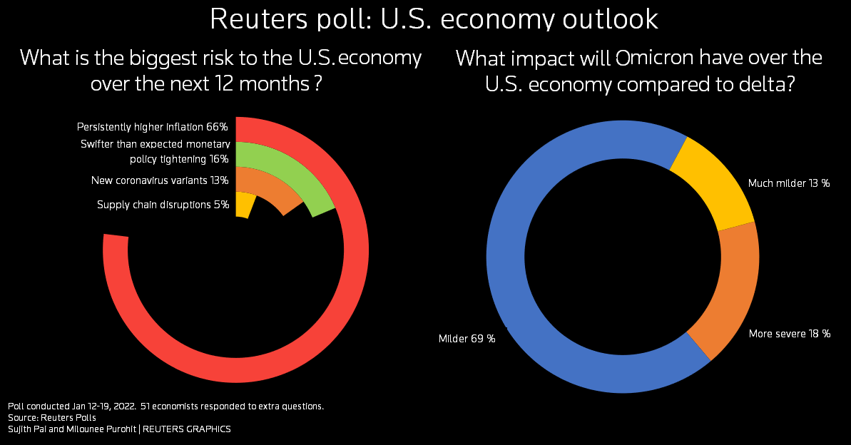 (图:路透关于美国经济前景的调查,左图:未来12个月美国经济面临的最大风险是什么?右图:奥密克戎变种对美国经济的影响与Delta变种相比强弱程度如何?)