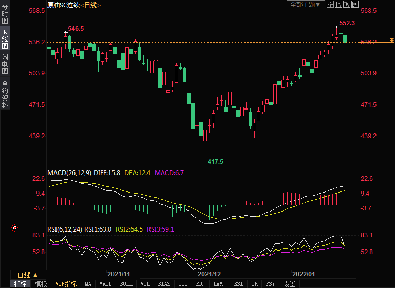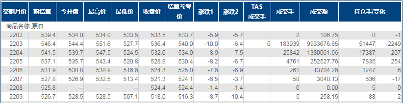 上海原油价格下跌1.83%,主力合约2203终盘收于536.4元/桶,跌10.0元/桶。