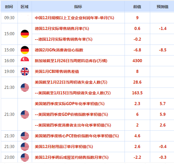 周四(1月27日)关键词:美国四季度GDP和PCE、初请失业金人数、二手房签约量、耐用品订单