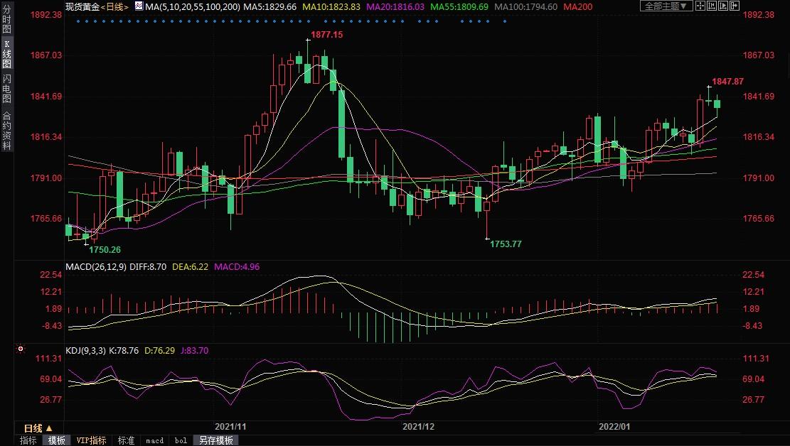 刚刚过去的一周,现货黄金震荡走高,因通胀担忧和俄乌地缘政治风险提升了黄金的避险吸引力,金价最高触及1847.87美元/盎司,尽管美联储3月份加息50个基点的预期和2022年加息4次的预期升温,美元本周强势上涨,但金价周线仍上涨0.96%,为连续第二周上涨,收报1835.38美元/盎司。