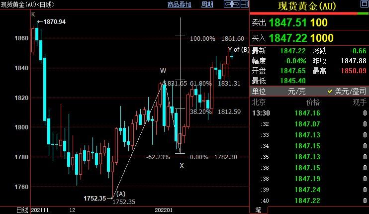 日线上看,金价处于自1782美元开启的上行Y浪,升破85.4%目标位1850美元,后市料上摸100%目标位1862美元。Y浪是自1752美元开启的上行(B)浪的子浪。(B)浪是自1877美元开启的下行((Z))浪的子浪,((Z))浪则隶属于自2075美元开启的调整IV浪。