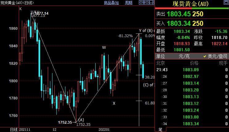 日线上看,金价处于自1854美元开启的下行(C)浪,跌破38.2%目标位1806美元,后市料下探61.8%目标位1777美元。(C)浪是自1877美元开启的下行((Z))浪的子浪,((Z))浪则隶属于自2075美元开启的调整IV浪。