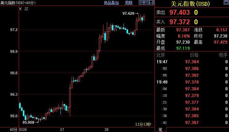 美指创2020年7月1日以来新高97.429,现货黄金刷新去年12月16日以来低点至1780.35美元/盎司。