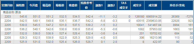 上海原油价格下跌2.03%,主力合约2203终盘收于534.5元/桶,跌11.1元/桶。