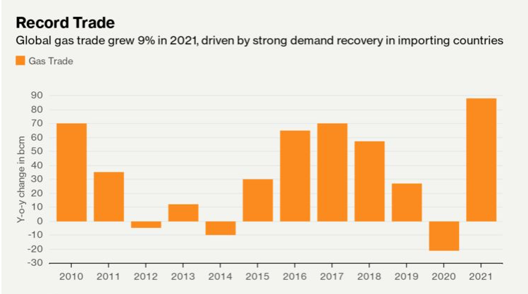 尽管如此,疫情后的需求复苏意味着去年全球天然气贸易增长创纪录,管道天然气流量激增12%,液化天然气贸易增长6%。