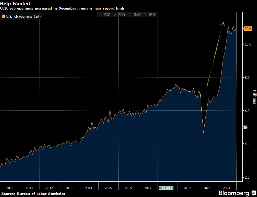 美国劳工部周二公布的职位空缺和劳动力流动调查报告显示,,2021年12月职位空缺数增至1090万,11月上修为1080万。彭博调查得到的经济学家预估中值为1030万。辞职率从前一个月3%的纪录高位略微降至2.9%,辞职数量也稍低于前一个月的纪录高位。
