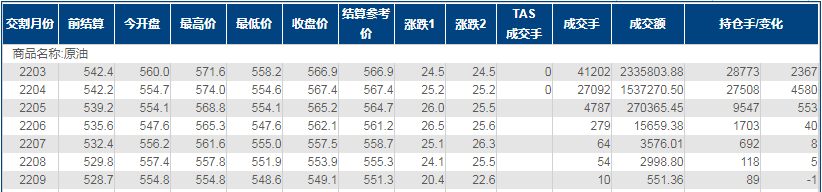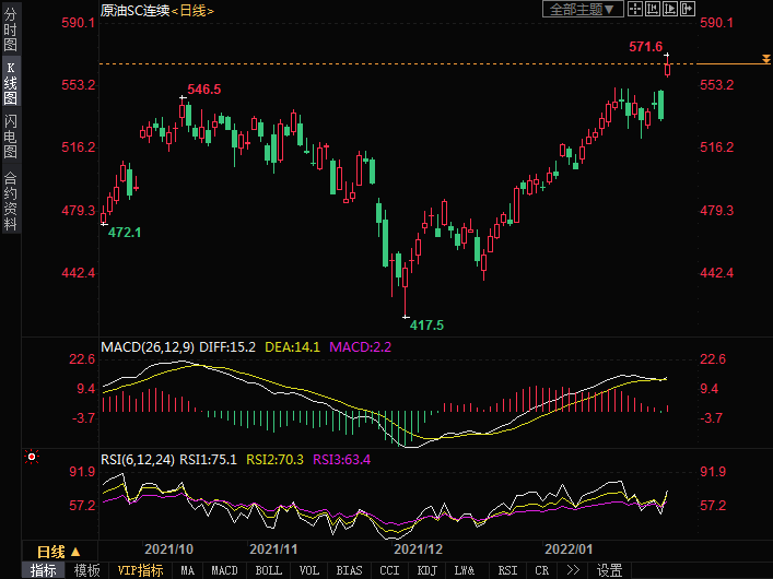 上海原油价格上涨4.52%,创逾三年新高,主力合约2203终盘收于566.9元/桶,涨24.5元/桶。