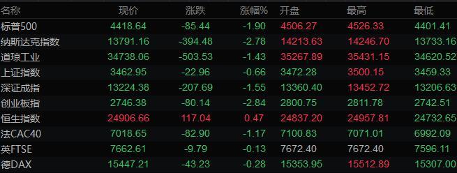 美股收盘情况:标普500指数下跌1.9%,报4418.64点;道琼斯工业平均指数下跌1.4%,报34738.06点;纳斯达克综合指数下跌2.8%,报13791.15点;纳斯达克100指数下跌3.1%,报14253.84点;罗素2000指数下跌1%,报2030.146点。