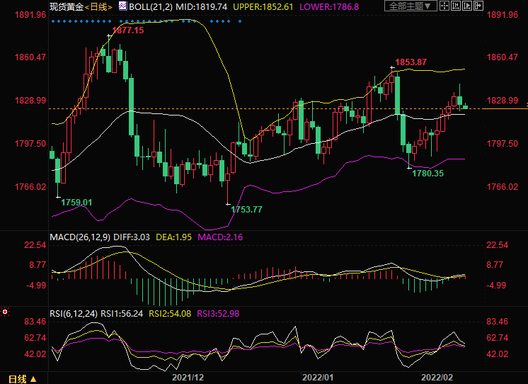 下方支撑关注布林中轨1819.75,跌破看向2月2日高位1810.85以及1800.00心理关口。