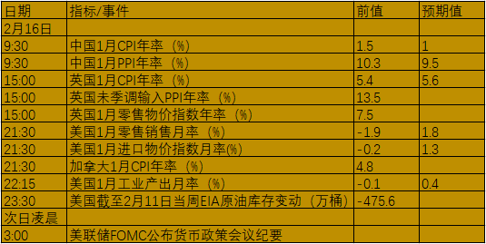 2月14日-20日当周,美国方面将公布PPI、零售销售、EIA及初请等重要数据,另外美联储还将公布1月会议纪要。其他国家需要关注的数据包括中国CPI、PPI,日本四季度GDP、英国失业率、欧元区信心指数等。美联储官员们也将会继续出面发表自己的货币政策主张。
