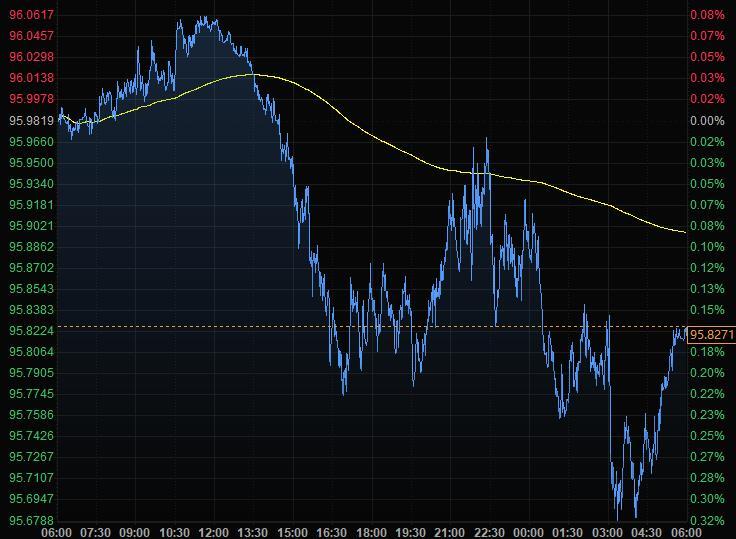 美元指数跌0.16%至95.82,该指数下跌的部分原因是,新兴市场货币上涨、以及2年期美国国债收益率走低。