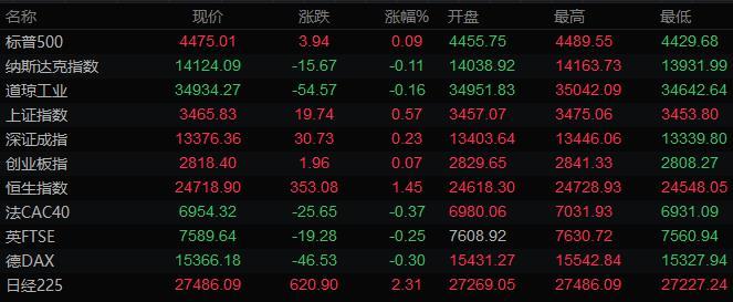 美股收盘情况:标普500指数上涨0.1%,报4475.01点;道琼斯工业平均指数下跌0.16%,报34934.27点;纳斯达克综合指数下跌0.1%,报14124.09点;纳斯达克100指数下跌0.1%,报14603.64点;罗素2000指数上涨0.1%,报2079.311点。