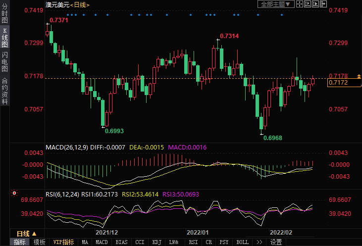 周三(2月16日)澳元兑美元在欧洲市场早盘小幅走高,并在过去两小时内攀升至0.7184附近的本周新高。