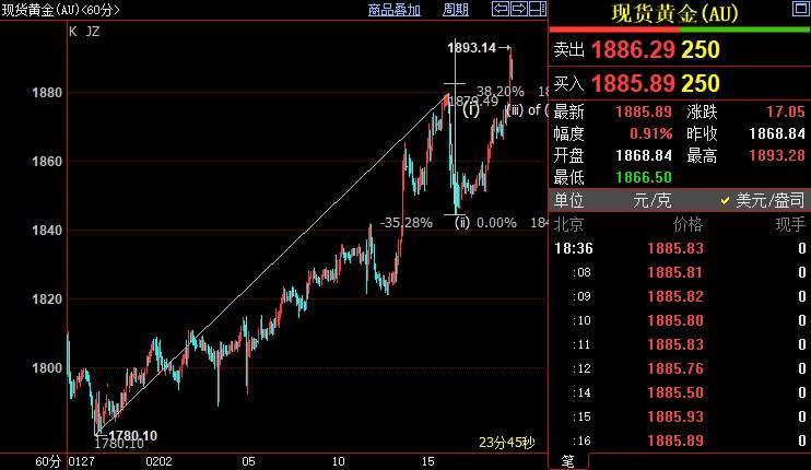 北京时间19:11,现货黄金上涨0.84%至1885.41美元/盎司;COMEX期金主力合约上涨0.84%至1887.2美元/盎司;美元指数上浮0.02%至95.772。