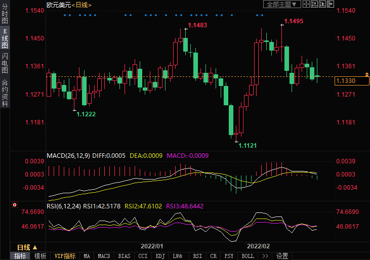 由于欧元兑美元位于2022年低点1.1100-1.1500区间的中间,该货币对的中期技术偏向保持中性。由于美国市场因总统日假期休市,本周一的交易环境将异常平静。