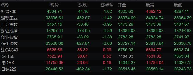 美股收盘情况:标普500指数下跌1%,报4304.76点;道琼斯工业平均指数下跌1.4%,报33596.61点;纳斯达克综合指数下跌1.2%,报13381.52点;纳斯达克100指数下跌1%,报13870.53点;罗素2000指数下跌1.5%,报1980.173点。