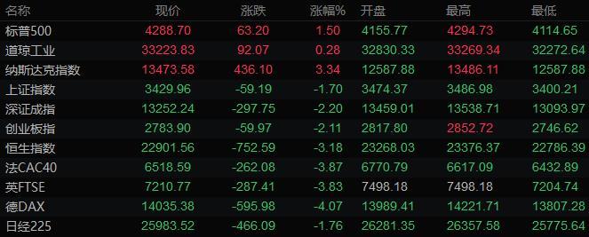 美股收盘情况:标普500指数上涨1.5%,报4288.7点;道琼斯工业平均指数上涨0.3%,报33223.83点;纳斯达克综合指数上涨3.3%,报13473.58点;纳斯达克100指数上涨3.4%,报13974.67点;罗素2000指数上涨2.7%,报1996点。