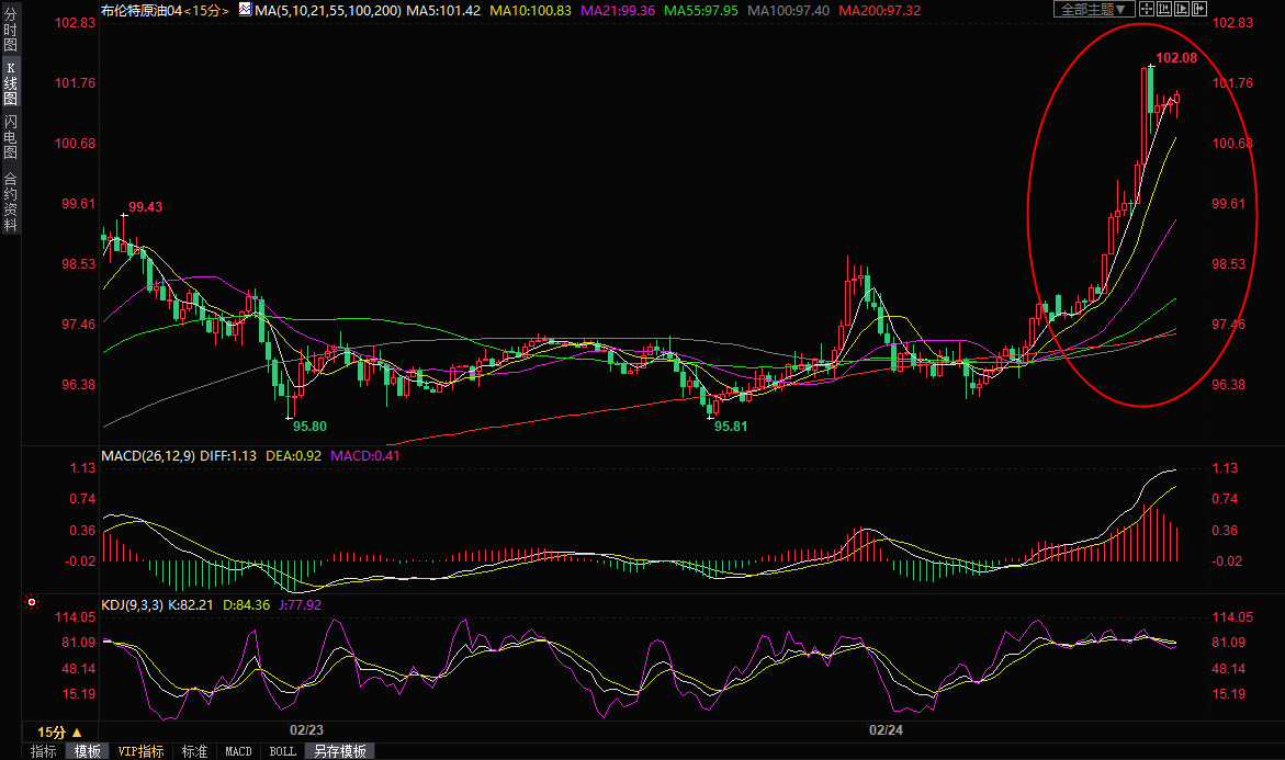 国际油价短线也大幅拉升,布伦特原油4月合约一度顶破100关口,创2014年9月以来新高至102.48美元/桶,涨幅约5.8%;美原油主力合约短线拉升了近4美元,创2014年9月以来新高至97.40美元/桶,涨幅约5.75%。