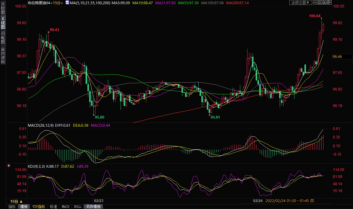 国际油价短线也大幅拉升,布伦特原油4月合约一度顶破100关口,创2014年9月以来新高至100.7美元/桶,涨幅约3.3%;美原油短线拉升了逾2美元,创一周半新高至95.52美元/桶,涨幅约3.7%。