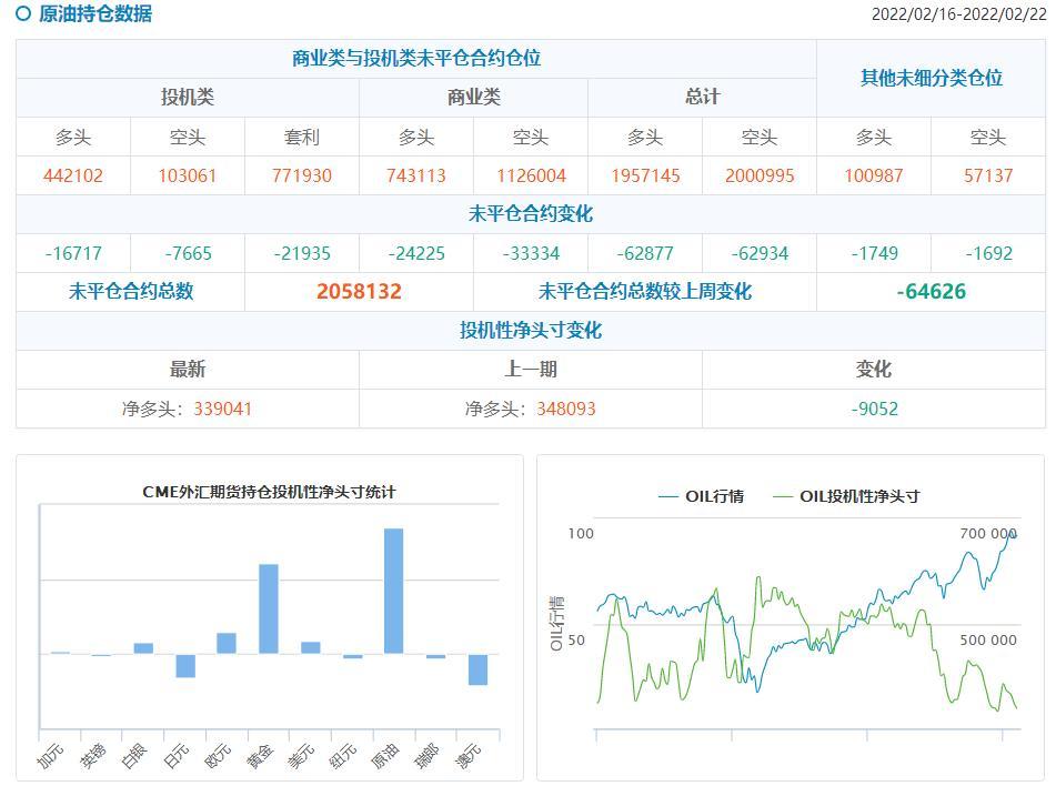 3、美国商品期货交易委员会(CFTC)数据显示,截止至2月16日至2月22日当周,投机者持有的原油投机性净多头减少9052手,至339041手合约,表明投资者看多原油的意愿降温。