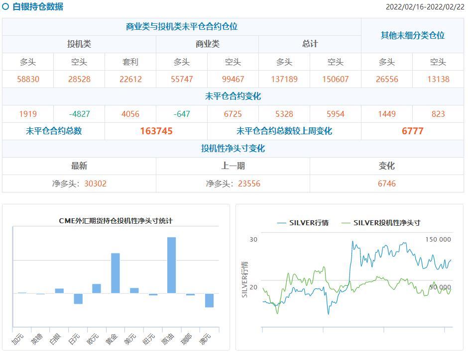 2、美国商品期货交易委员会(CFTC)数据显示,截止至2月16日至2月22日当周,投机者持有的白银投机性净多头增加6746手合约,至30302合约,创最近4周新高,表明投资者看多白银的意愿继续升温。