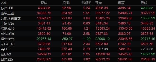 美股收盘情况:标普500指数上涨2.2%,报4384.65点;道琼斯工业平均指数上涨2.5%,报34058.75点;纳斯达克综合指数上涨1.6%,报13694.62点;纳斯达克100指数上涨1.5%,报14189.16点;罗素2000指数上涨2.3%,报2040.929点。