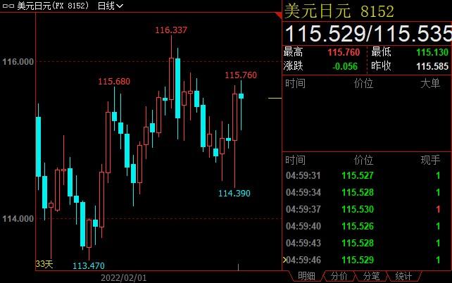 美元兑日元收高0.39%至115.529。不断上升的通胀、即将到来的选举、加上日元贬值推高生活成本,料将促成日本央行立场终于出现原本难以想像的鹰派转变,而且可能最快今年夏季就会实现。