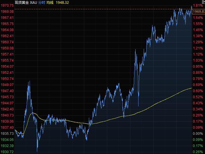 现货黄金周五继续上涨,尾盘收于1970关口附近,此前公布的美国非农就业报告显示尽管上个月就业人数激增,但工资增长放缓。