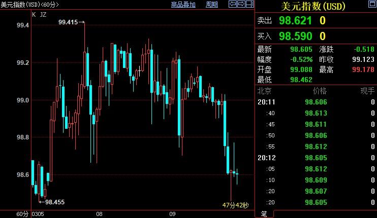 北京时间20:11,现货黄金下跌1.79%至2013.13美元/盎司;COMEX期金主力合约下跌1.06%至2021.7美元/盎司;美元指数下跌0.51%至98.605。