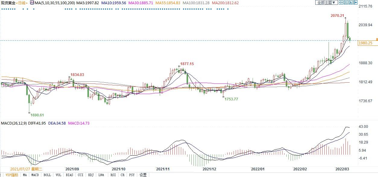 北京时间3月10日13:42,现货黄金报1980.23美元/盎司。