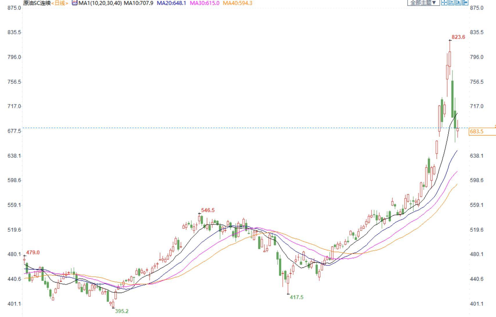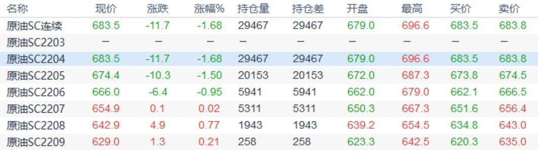 周一(3月14日)上海原油价格收盘下跌11.7,跌幅1.68%。主力合约2204终盘收于683.5元/桶,跌11.7元/桶,地缘局势风险担忧略有缓和,阿联酋宣布支持超量增产,缓解了市场对原油供给的担忧。油价自高位有所回落。