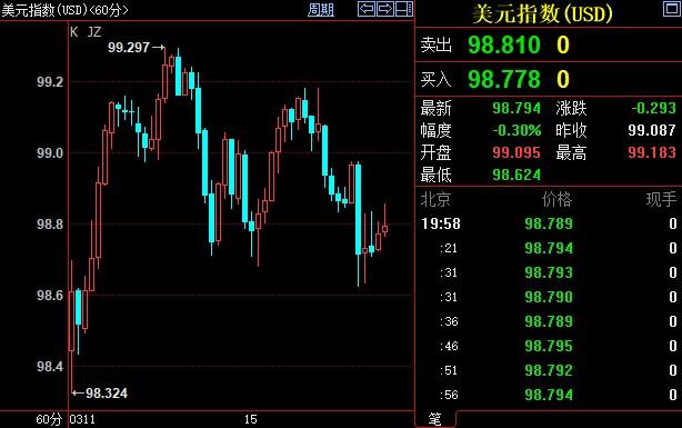 北京时间19:58,现货黄金下跌1.36%至1924.36美元/盎司;COMEX期金主力合约下跌1.74%至1926.7美元/盎司;美元指数下跌0.34%至98.792。