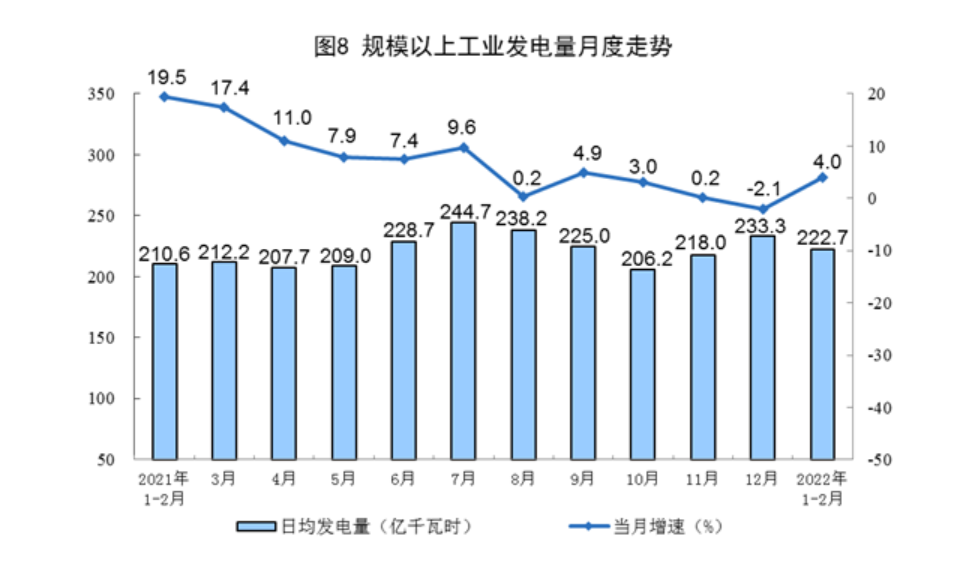 电力生产由降转升。1—2月份,发电量13141亿千瓦时,同比增长4.0%,上年12月份为下降2.1%,日均发电222.7亿千瓦时。