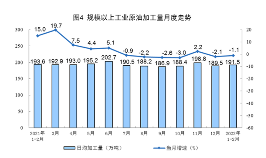 原油加工量略有下降。1—2月份,加工原油11301万吨,同比下降1.1%,降幅比上年12月份收窄1.0个百分点,日均加工191.5万吨。