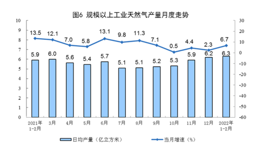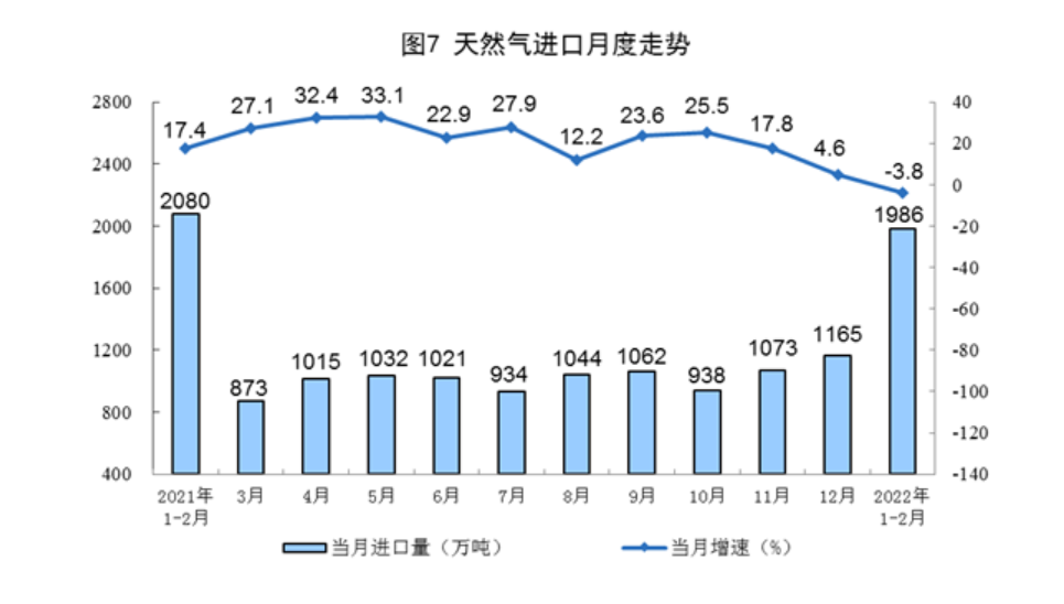 天然气生产保持增长,进口下降。1—2月份,生产天然气372亿立方米,同比增长6.7%,增速比上年12月份加快4.4个百分点,日均产量6.3亿立方米。进口天然气1986万吨,同比下降3.8%,上年12月份为增长4.6%。