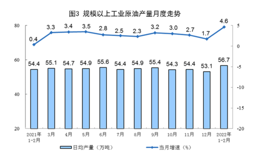 原油生产稳定增长,进口由增转降。1—2月份,生产原油3347万吨,同比增长4.6%,增速比上年12月份加快2.9个百分点,日均产量56.7万吨。进口原油8514万吨,同比下降4.9%,上年12月份为增长20.1%。
