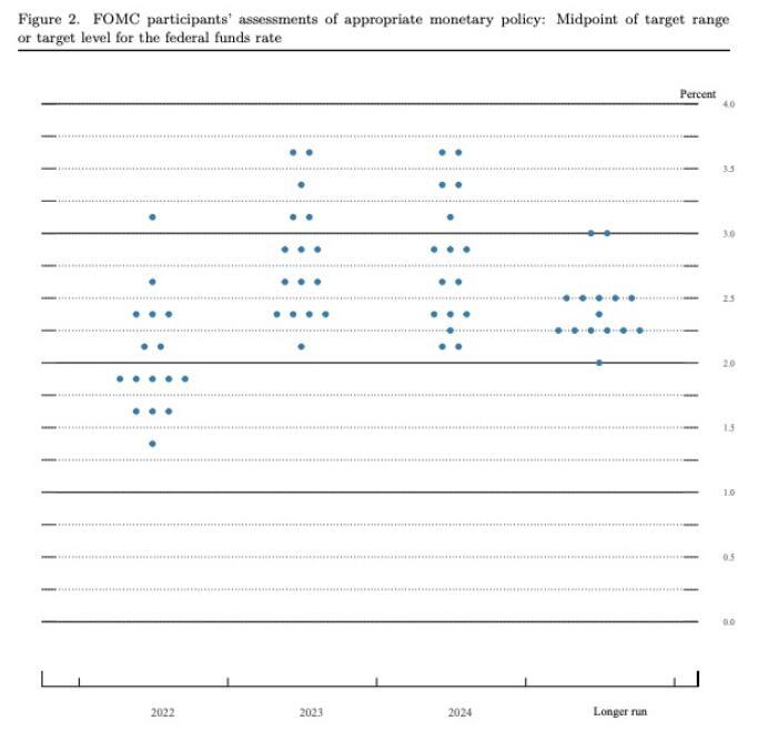 尽管经济增长风险上升,但面对四十年来最高的通胀率,美联储周三决定升息25基点,并暗示年内还会进行六次同等幅度的加息。此次加息很可能只是一个开始,因为美联储表示“预计联邦基金目标利率区间的持续上升将是适宜的”,主席鲍威尔承诺将“灵活应变”。在美联储发布的点阵图中,官员们预测中值是基准利率到2022年末将在1.9%左右,与交易员的预期一致,但高于美联储先前的预期。