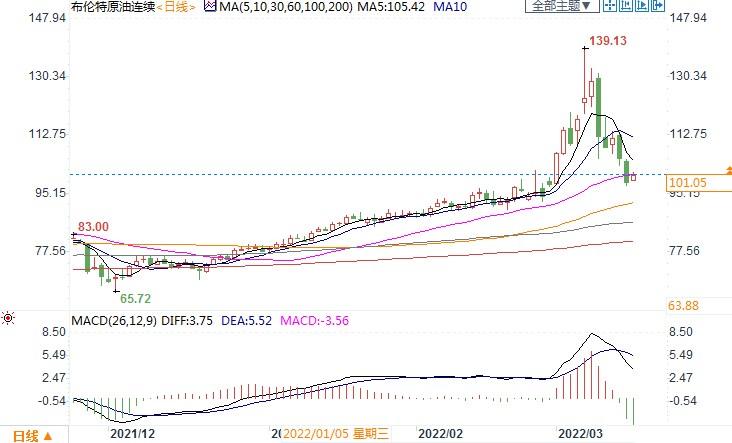 北京时间3月16日11:28 布伦特原油连续报每桶101.05美元