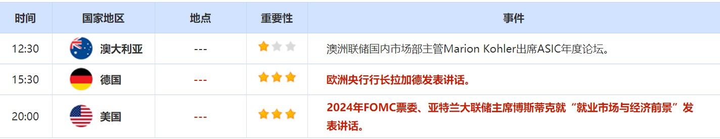 ①周一(3月21日)关键词:新西兰2月贸易帐,欧洲央行行长拉加德,亚特兰大联储主席博斯蒂克;