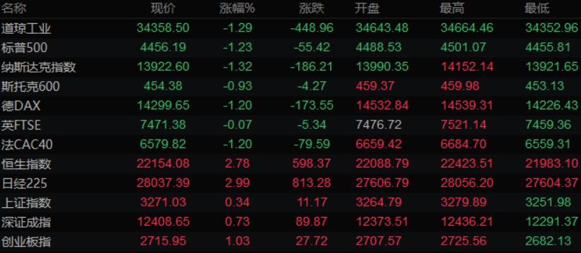 美股收盘情况:标普500指数下跌1.2%,报4456.24点;道琼斯工业平均指数下跌1.3%,报34358.5点;纳斯达克综合指数下跌1.3%,报13922.6点;纳斯达克100指数下跌1.4%,报14447.54点;罗素2000指数下跌1.7%,报2052.206点。