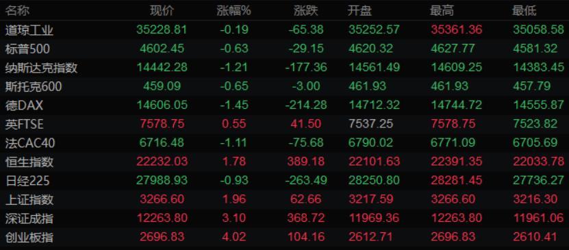 美股收盘情况:道琼斯指数收盘下跌105.93点,跌幅0.30%,报35188.26点;标普500指数收盘下跌28.40点,跌幅0.61%,报4603.20点;纳斯达克综合指数收跌177.36点,跌幅1.21%,报14442.28点。