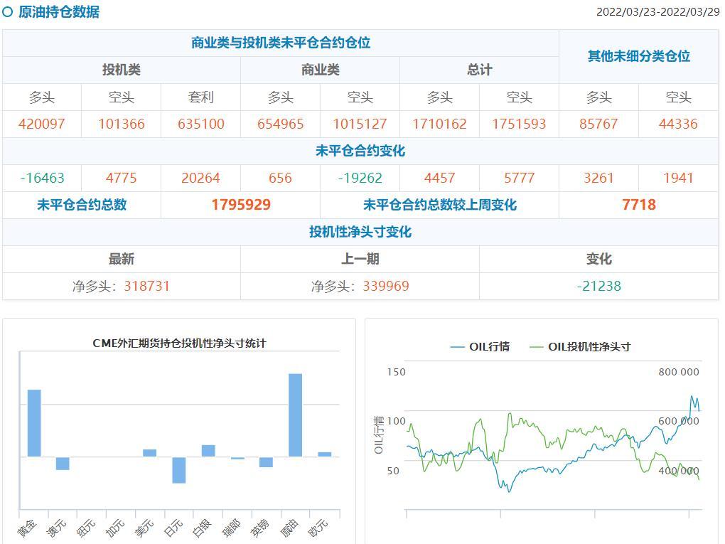3、美国商品期货交易委员会(CFTC)数据显示,截止至3月23日至3月29日当周,投机者持有的原油净多头头寸减少了21238手,至318731手合约;投机者所持NYMEX WTI原油净多头头寸减少5949手合约,至257908手合约。