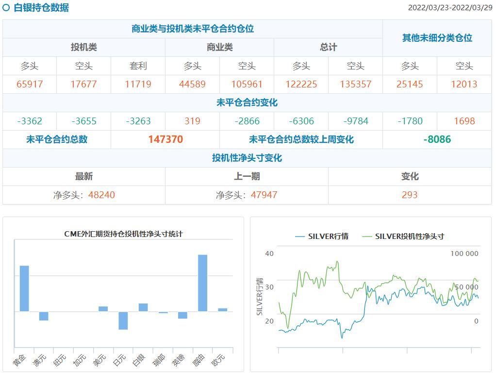 2、美国商品期货交易委员会(CFTC)数据显示,截止至3月23日至3月29日当周,投机者持有的白银投机性净多头头寸增加293手,至48240手合约,表明投资者看多白银的意愿出现升温。