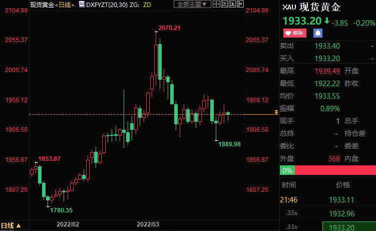 截止发稿,现货黄金本周累计下跌1.36%至1931.30美元/盎司,盘中创今年2月25日以来新低至1889.98美元/盎司。