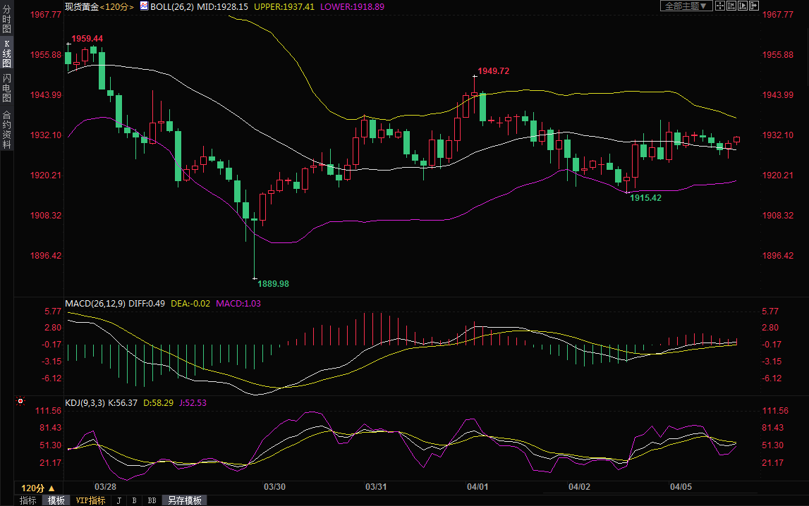 2小时级别:震荡;布林线收口,技术指标信号较弱,留意布林线轨道1918.90-1937.41区域突破情况。