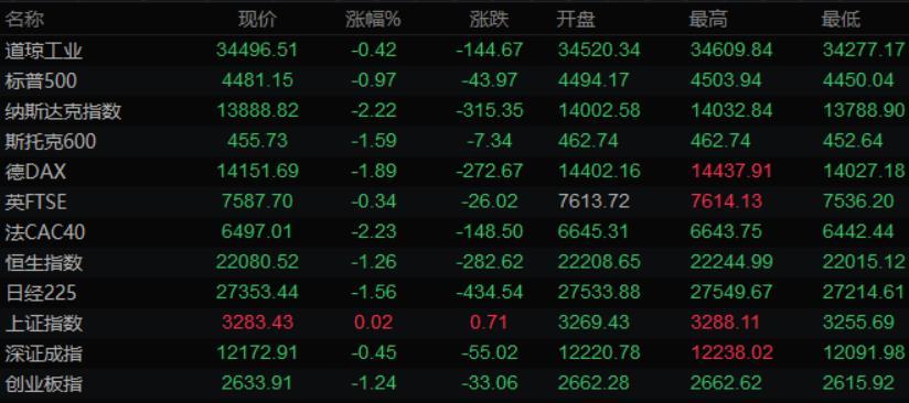 美股收盘情况: 道琼斯指数收盘下跌144.54点,跌幅0.42%,报34496.64点;标普500指数收盘下跌44.32点,跌幅0.98%,报4480.80点;纳斯达克综合指数收跌315.35点,跌幅2.22%,报13888.82点。